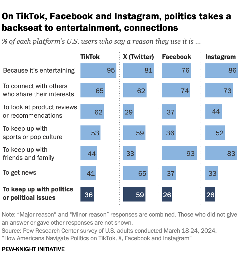 While politics certainly is a motivator for people to use social media, it certainly still isn’t the number one reason. 95% of TikTok users say they use the platform because it is entertaining. This is also the top reason X users say they use the platform, at 81%, and Instagram users, at 86%. However, there is one other huge motivator for Instagram and Facebook — keeping up with friends and family. 93% of Facebook users say this is a reason they still use the platform, and 83% of Instagram users say the same. Overall, entertainment is still the largest motivator for social media users as a whole.